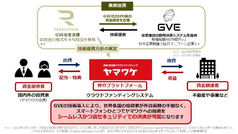 提携により、REVOLUTIONグループが手掛けるクラウドファンディングサービス「ヤマワケ」の安全性をさらに強化します。国境を超えた投資の煩雑な手続きも軽減し、海外からのプロジェクトへの投資も呼び込む計画です。